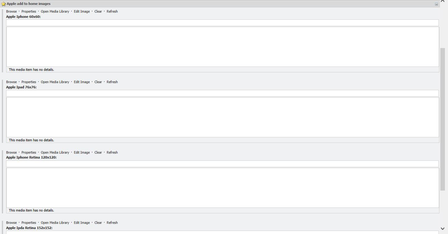 <link rel=”apple-touch-icon” href=”<%= GetAppleShortcut(“Apple Iphone 60×60”)%>” > You could do things better here 😀 ; usually I use xslt for the meta tags.
